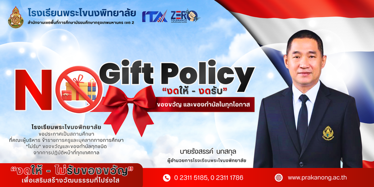 ประกาศแสดงเจตนารมณ์ "สุจริต โปร่งใส โรงเรียนพระโขนงพิทยาลัยใสสะอาด 2569" และ "งดรับ งดให้ ของขวัญของกำนัลทุกชนิดจากการปฏิบัติหน้าที่ (No Gift Policy) 09 มี.ค. 69
